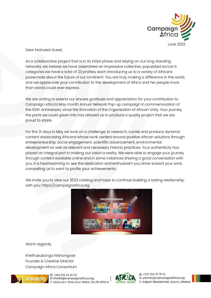 Our vision for Campaign Africa & Africa Global Radio, and everything I do, is to provide authentic narratives on Global Africa, which will inspire the next generation to be the change we wish to see, and ultimately contribute to transformational change in Africa.